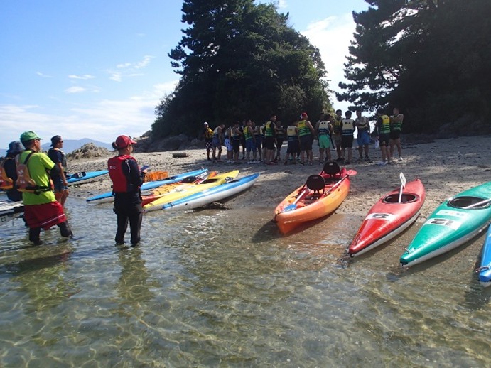 実習では、普通科スポーツ科学コース3年生の21名が、B&G海洋センターの1km沖にある無人島までのカヌー体験をしました。シーカヤックと異なり思うように進まないカヌーに苦戦する生徒が多く、バランスを崩して転覆する者もいましたが、PWCレスキューや救助用ボートでのサポート体制を整えていたこともあり、全員が無事に無人島にたどり着くことができました。