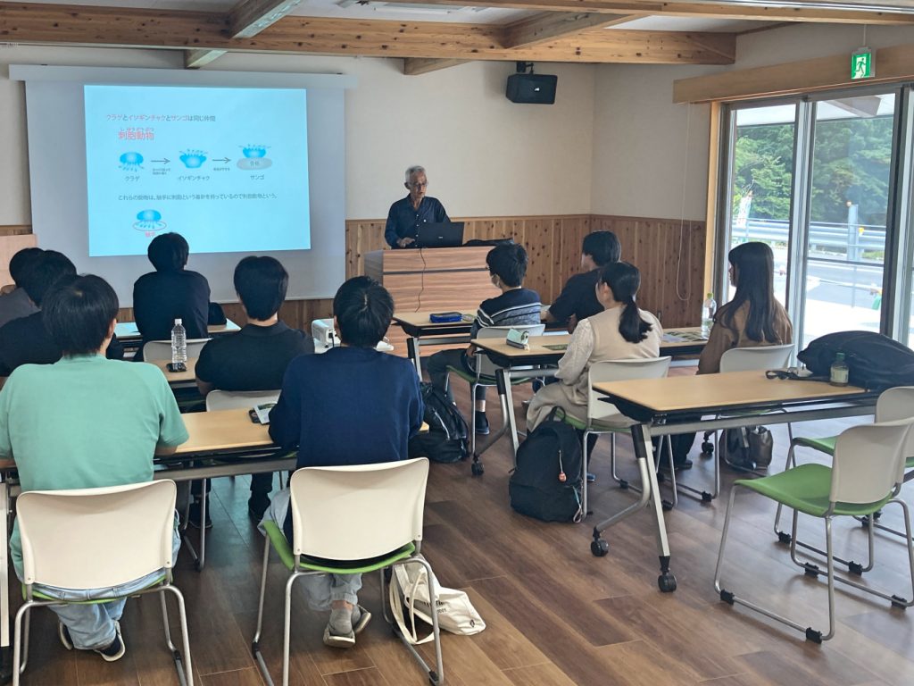 本年度のテーマである「ニホンアワサンゴのリアルタイム配信システム構築」に向けて,世界最大のニホンアワサンゴの群生地である地家室の海を目の前にしながら,ニホンアワサンゴの生態や,周防大島の自然環境整備などの講習を受けました。参加学生からも積極的に質問が出るなど,非常に有意義な講演会となりました。