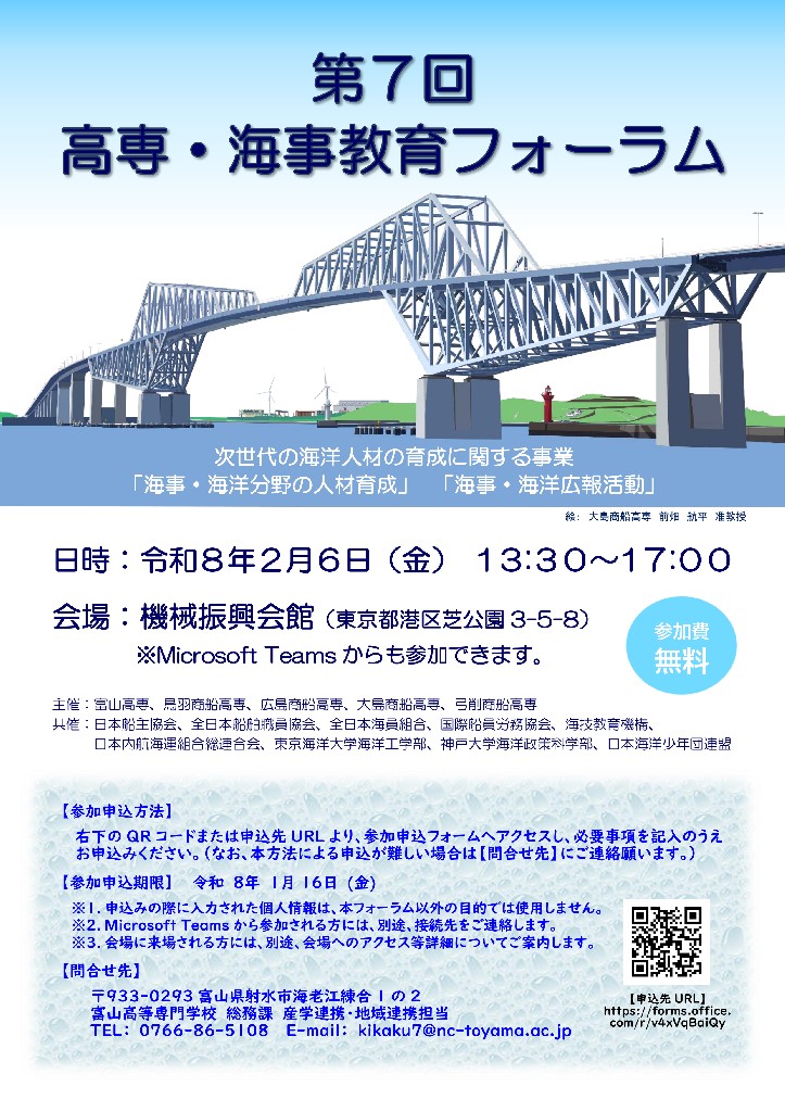 令和8年2月6日(金)に、機械振興会館ホール(東京都港区芝公園3-5-8)において、「第7回高専・海事教育フォーラム」を開催します。