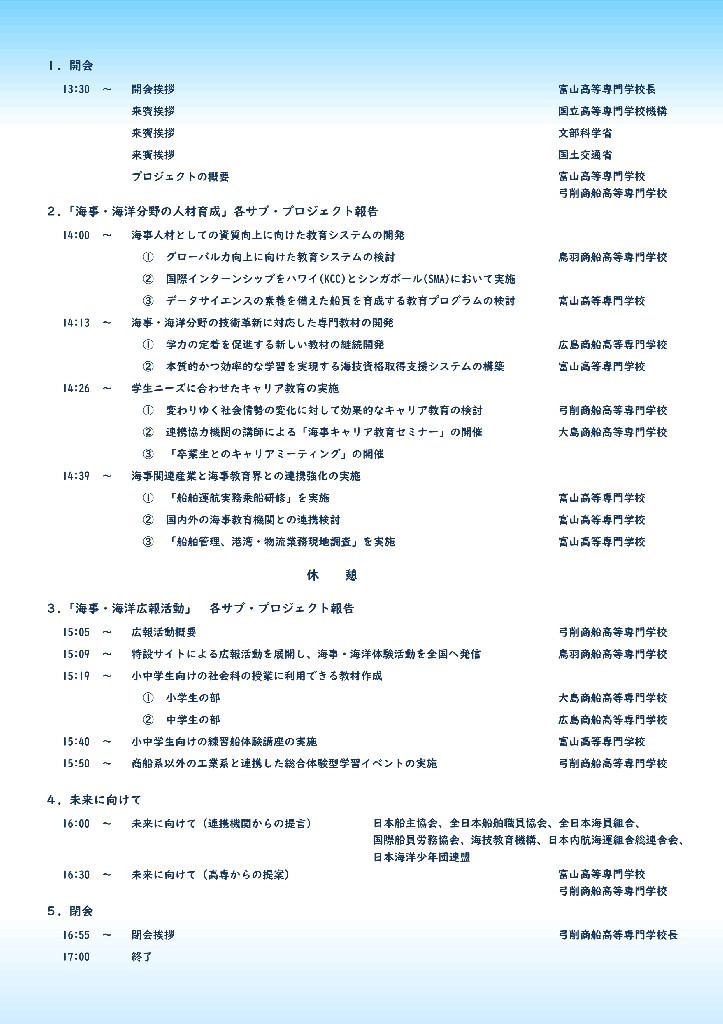 本フォーラムは、商船学科を有する5高専と7連携機関(海事関連団体・海事教育機関)が連携し実施している「次世代の海洋人材の育成に関する事業」の活動状況及びその成果を、広く海運業界にご紹介することを目的としております。